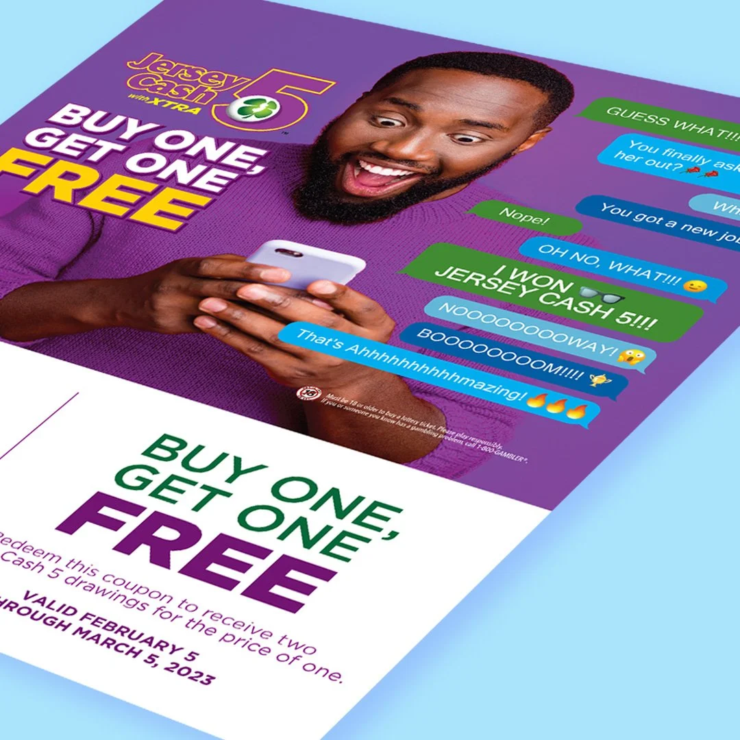 For this Jersey Cash 5 push, I designed a flyer centered on the excitement of sharing a winning moment. The concept captures the instant connection players feel when they text friends to tell them, “I just hit JC5!”—a mix of thrill, pride, and community that defines the Lottery’s social experience.